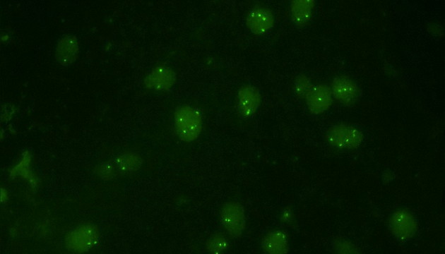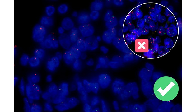 熒光原位雜交(Fluorescence In Situ Hybridization,F(xiàn)ISH)是臨床病理檢測(cè)中廣泛運(yùn)用的一種分子細(xì)胞遺傳學(xué)診斷技術(shù),其原理是用熒光染料直接或間接標(biāo)記的DNA核酸探針與待測(cè)樣本中的DNA核酸序列按照堿基互補(bǔ)配對(duì)的原則進(jìn)行雜交,然后通過(guò)熒光顯微鏡觀(guān)察熒光信號(hào)位置、數(shù)量等來(lái)判斷待測(cè)序列的缺失、擴(kuò)增及易位等情況。其高分辨率、直接反映異常細(xì)胞比例、快速簡(jiǎn)便的特點(diǎn),使其成為臨床檢測(cè)、預(yù)后評(píng)估及用藥指導(dǎo)的重要工具。