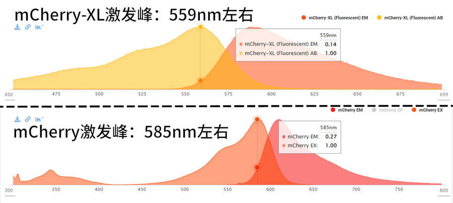 熒光團(tuán)改良后,不僅熒光強(qiáng)度更高、熒光壽命更長(zhǎng),其激發(fā)發(fā)射屬性也可能發(fā)生變化。比如mCherry-XL和mScarlet3,它們需要使用Y通道激發(fā),而不是原版mCherry的R通道激發(fā)。