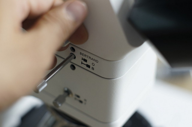 ④勃氏鏡(Bertrand Lens):勃特蘭透鏡在錐光觀察時(shí)使用,用于形成干涉圖,干涉圖的形態(tài)因晶體的光性和切片方向而不同,可借以鑒別晶體的軸性、切片類型、光性符號(hào)等屬性。必須搭配無(wú)應(yīng)力物鏡使用。
