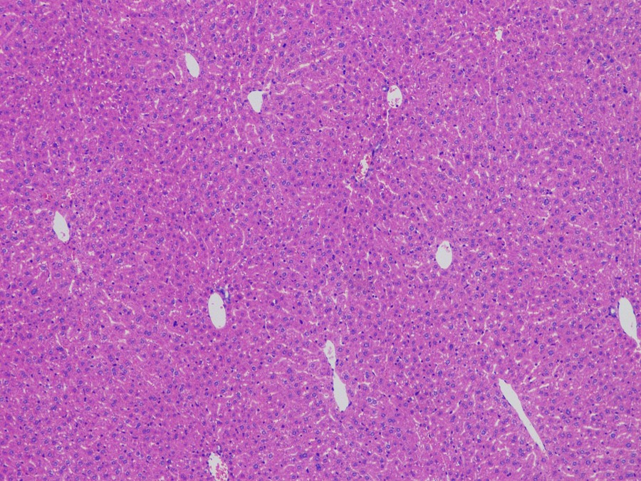 肝臟主要由肝細胞組成,正常的肝臟HE染色切片在鏡下呈現(xiàn)為綿密的肝細胞,細胞核清晰可見且形狀比較規(guī)則,細胞間有少量不規(guī)則的空洞區(qū)域。