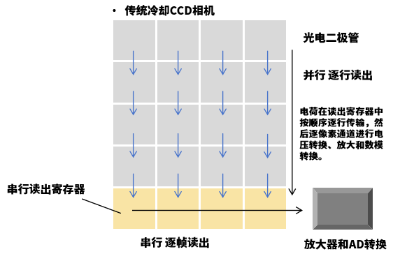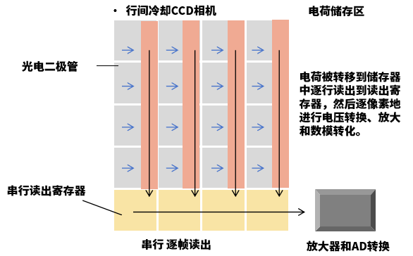 冷卻CCD是使用傳感器陣列設(shè)計(jì)的兩種技術(shù)中較老的一種。在最簡(jiǎn)易的CCD陣列實(shí)現(xiàn)中,落在每個(gè)傳感器(像素)上的光被轉(zhuǎn)換為電子。在曝光結(jié)束時(shí),存儲(chǔ)在傳感器中的電子信號(hào)被順序地逐行轉(zhuǎn)移到讀出寄存器,然后逐幀放大并轉(zhuǎn)換為數(shù)字值(圖3)。